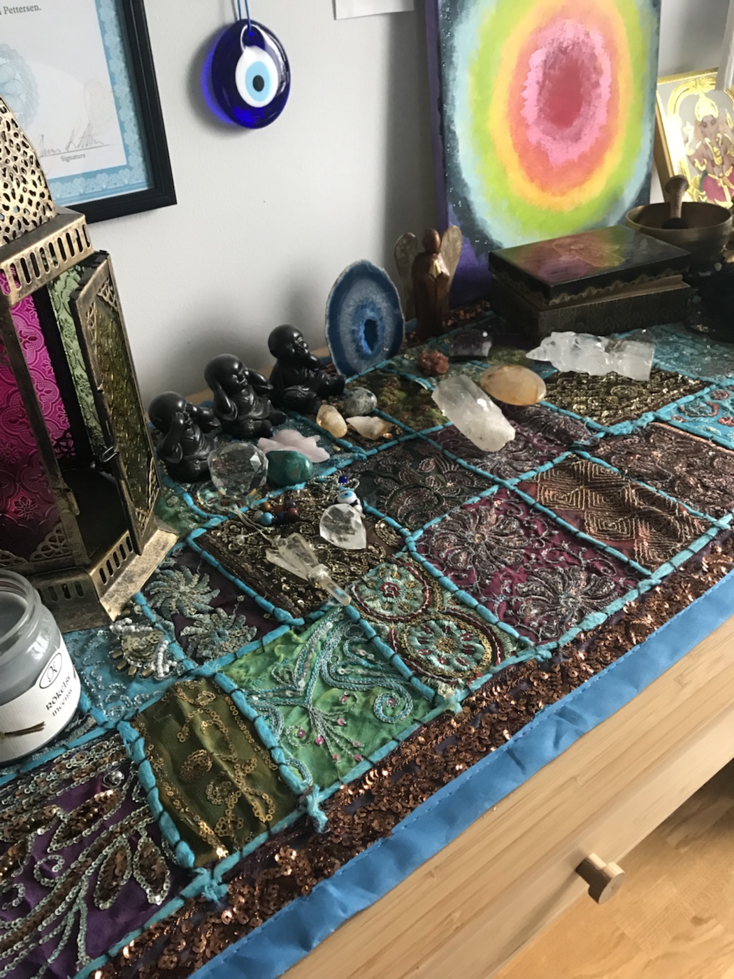 Jag mediterar här inne. Jag grejar med mina kort och lägger ut kristallnät. Jag sitter därinne och känner doften från rökelse och jag känner lugnet där. Fast just nu är det lite för stökigt. Jag måste ta tag i det – för när det blir rörigt och stökigt – då blir mitt inre likadant.
