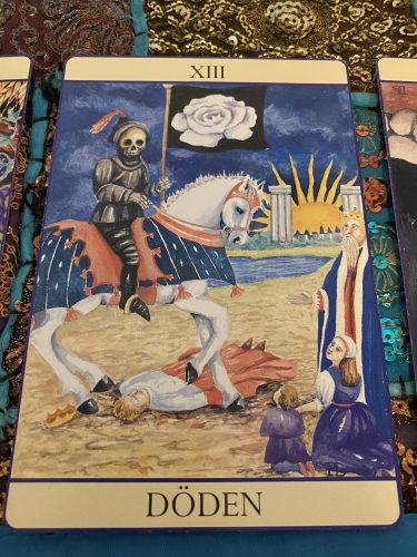 Döden: Detta är en väldigt positivt kort, fast man inte kan tro det vid första anblicken. Döden står för en positiv förändring, gammalt skräp i ditt liv försvinner och du kan börja om. Död/undergång är en naturlig del av kretsloppet – och nu kan du verkligen skaka av dig allt det döda och gamla – och stiga som en nyfödd fågel Fenix. Du kan känna dig rädd och osäker inför detta, för det är ju så att vi tenderar att hålla fast i det gamla och invanda, även om vi vet att det inte tillför oss något gott längre. Vi måste rensa ut för att få plats med nytt. Det kan även här handla om bostad, relationer, arbete – eller kanske bara gamla föreställningar, åsikter och fördomar. Detta kan vara en skakig tid – och alla relationer som klarar sig genom denna tid kommer att förbli starka för evigt. Det här kortet lovar oss ett ljus i tunneln, och – vad vi behövde få höra det!