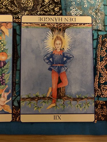 Den hängde (omvänd): Jag slutar aldrig att bli överraskad av den här kortleken. Det här kortet omvänt säger dig att du är i slutet av en tid av lidande eller obeslutsamhet. Det du velat göra/behövt göra, men inte gjort – det är dags nu. Du behöver tänka på att vara försiktig med hastiga beslut – och om du under en tid känt ett behov av ensamhet och velat dra dig undan lite så är det inget märkligt. Du är i en tid då du behöver tänka, ta det lugnt i dig själv och tänk på hur du kan agera och planera för att förändringen ska bli till din fördel. Inget kommer gratis – du har massor av erfarenheter och visdom i ditt inre. Ta fram dem. Vi är klara med puppstadiet – dags att breda ut vingarna och flyga!