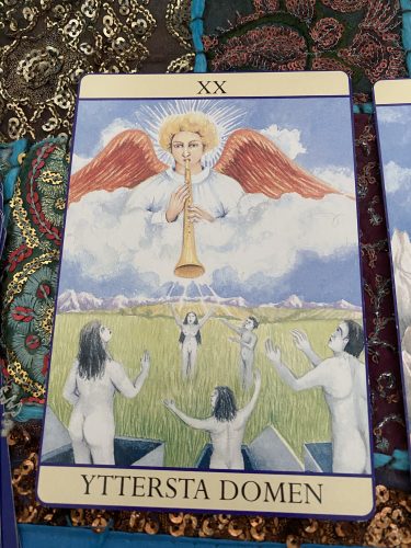 Yttersta domen: ja – det var ju ett diskret första kort 😉 Det här kortet talar om att du gjort framsteg – det har hänt grejor och det du går och funderar på och kanske grubblar över är på väg att genom dina kloka val få en lösning. I vilket fall så kommer en förbättring. Om du känt dig låg en tid så vänder det nu – och precis som fullmånen som vi får i morgon så kan du känna dig uppfylld och full av kraft och energi. Det är en bra tid nu, för att fatta det där jobbiga beslutet – du kommer att kunna se klart på dina val och göra det som är bäst för just dig. Det är en tid för nyheter – för en del av er väntar ett nytt jobb, en bostad eller en ny kärlek bakom hörnet. Var beredd på överraskningar!