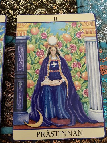 Prästinnan: Här kommer kortet som knyter ihop de andra denna vecka. När det här kortet kommer upp så behöver du ha fokus på din inre kunskap. Du behöver lyssna inåt för att till fullo förstå de valmöjligheter du har. Om du funderar över en relation så kan du ställa frågor till dig själv ungefär så här: Vad behöver jag verkligen veta om den här personen? Vad känner jag i hela mitt inre inför den här personen eller situationen? Vänta stilla på svaret. Det kommer till dig om du har tålamod. Du kan känna att du vill dra dig undan lite nu, för att fundera och vara ifred med dina tankar. Följ din inre vägvisare, och lita på den, så går du inte fel.