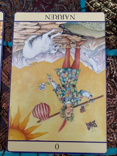 När Narren kommer omvänd så är det ett tecken till dig att det är dags att stanna upp. Om du har för bråttom kommer du att missa viktiga saker – och du ser inte det som egentligen är helt uppenbart och det som presenteras mitt framför dig. Narren är precis som du en fri själ – men du ska inte ta för lätt på den friheten. Överväg dina steg, ta inte första bästa chans som blir synlig för dig. Även om du längtar efter äventyr och förändring så behöver du vara klok och försiktig i dina val och verkligen känna efter vilken väg du ska välja. Ett klokt råd från Narren just nu är att sova på saken. Du måste inte svara på allt direkt.