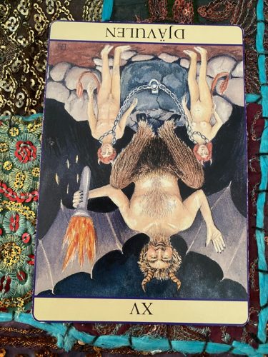 Djävulen är ett tvetydigt kort – och när det kommer upp omvänt så handlar det om frihet. Du har gått igenom en tung tid, som tagit all din kraft och energi – och det här kortet kommer till dig idag för att berätta att du är i slutet på den här perioden. Du kommer att lämna den med rak rygg – och med någon form av seger.