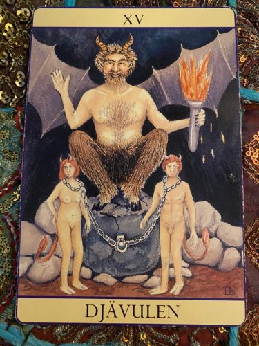 När det här kortet dyker upp i en läggning så är det dags att titta inåt, på sig själv och erkänna både de ljusa och mörka delarna av vårt inre. Först när vi exponerar vårt mörker kan skuggorna skingras. Det är dags för det nu. Om du tittar noga på kortet så ser du att personerna på bilden faktiskt inte alls sitter fast. Hur tolkar du det – om du tittar på dig själv och ditt liv?