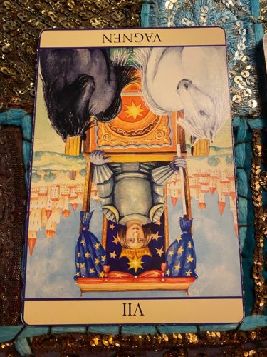 Kortet uppmanar dig att stanna upp och se på vad som faktiskt händer. Du behöver förhålla dig klar och lugn i sinnet. Du får inte tappa fokus nu, du vet vad du behöver göra och nu är det dags att agera. Lyssna inte på den negativa inre rösten som försöker få dig att ge upp – den rösten är egots och den vill få dig att återgå till det ytliga, yttre livet där pengarna och statusen styr. Du vet att det finns något annat och det är mot det du nu måste styra din vagn. Det är du som styr, hästarna följer ditt hjärtas väg – till och med utan tömmar.