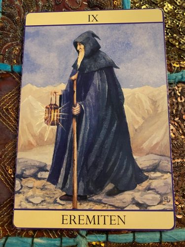 Det här kortet visar på behovet av ensamhet och reflektion. Du har kört på i full fart och någonstans tar bensinen slut även för dig. Du kommer inte vidare nu, utan återhämtning. När du stannar upp så kommer du att märka att ljuset kommer att lysa på din väg, och eremitens lugna tempo kommer att skapa en välförtjänt paus i ditt liv. Du måste inte gasa hela tiden. Ibland behöver du stanna till och ställa dig frågor som: Var är jag på väg egentligen? Vem är jag? Vilken är min rätta väg? Hur hittar jag lugnet?