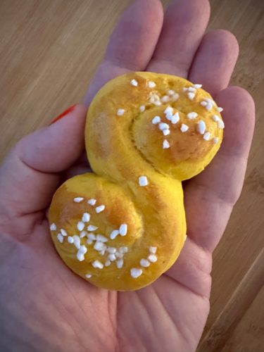 Lussebullarna blev så fina idag – små och fjäderlätta – och goda 🙂 Jag är ganska dålig på vetebullar annars, har dåligt tålamod med degvätskans temperatur och det där med jäsningen… Men idag skärpte jag till mig och då blev dom helt perfekta!