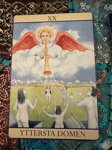 Det här kortet handlar om att frigöra sig från det gamla – ett uppvaknande. Kanske har du hört ängelns trumpet kalla på dig? En känsla av att du är menad att göra något, gå någonstans?