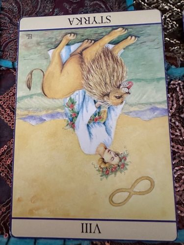 Styrka handlar också om att våga se delar av sig själv som du kanske inte är van att möta. Kvinnan på kortet har tämjt lejonet – alltså det vilda i sig själv – och hon kan helt utan rädsla utforska sina inre styrkor och utmana sitt inre mörker.