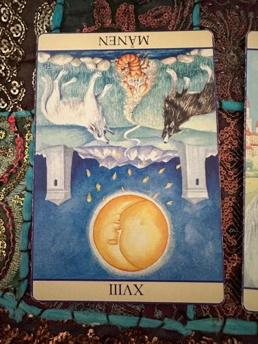 Det här kortet handlar om att komma i kontakt med våra egna skuggor. Märkligt (eller kanske inte ändå) att det här kortet kommer upp just idag när jag skriver om relationer och förväntningar… När det här kortet kommer upp uppmanas vi att vända oss inåt och låta månen lysa på våra rädslor, minnen och känslor. En del av dem spricker i ljuset av månen, därför att vi skapat ett skal kring dessa rädslor eller minnen som kanske inte alltid är helt sanna. Med tiden har de omskapat sig, för att passa våra känslor och vara bekväma för oss att bära runt på. Dags att städa upp! När dammet skingras så kommer du att se saker mer klart. Kanske är det dags att byta arbete eller bostad? Kanske behöver du rensa i dina relationer? Något kommer att stå helt klart för dig och du kommer att kunna gå vidare med en ny styrka och visshet. Du behöver fundera över hur du kan använda alla dina känslor till din fördel, istället för att fastna i negativa tankar och låta dem påverka dina beslut. Vilka minnen kommer upp i din inre städning? Vad behöver du göra för att komma vidare?