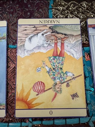 Narren symboliserar barnet i oss och har en naiv nyfikenhet och renhet inför livet. Han tar klivet ut i det okända i total tillit till att livet vill honom väl. Han har inget behov av kontroll, han går sin egen väg. Kortet bjuder in dig till att omfamna ditt inre barn, att kanske ibland våga fast du inte ser var vägen slutar.