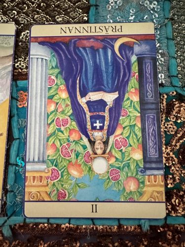Omvänt visar det här kortet på att du kan känna en rastlöshet i dig. Du behöver träna på att bevara ditt lugn och inse att du inte alltid kan styra och ha kontroll. Påminn dig själv om att du har svaren i dig, att du är din egen vägledare och att du behöver stå med fötterna fast förankrade i Moder Jord.