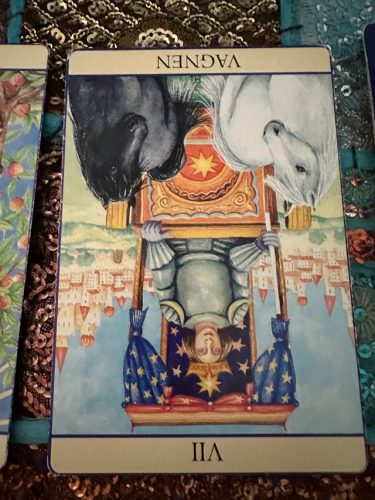 Det här kortet visar alltid på rörelse, på en resa i någon form. Omvänt kan det stå för ändring av planer och kanske en känsla av att allt gick åt skogen. Men deppa inte över det – för det finns en mening med detta. Även om det känns som att du tappar sugen så ska du inte ge upp. Lyssna på ditt inre, men var noga med att skilja på ditt hjärtas önskan och din inre kritikers vilja att puffa dig mot egots väg. Lyssna inte på saker som: det går ändå inte, det kommer ändå att gå åt helvete, varför skulle jag…